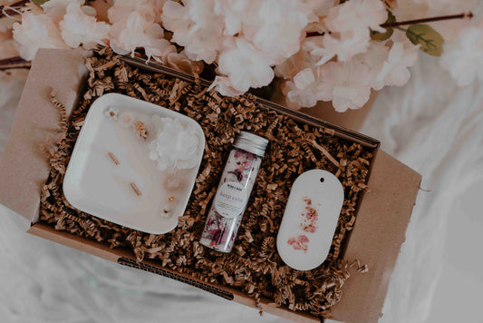 Coffret cadeau personnalisable, bougie fleurie, sel de bain et tablette de cire